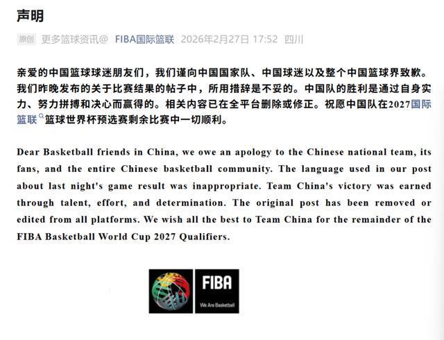2月26日中国男篮在冲绳客场87比80逆转日本队后,FIBA篮球世界杯官方社媒账号在战报里写下“China with a sneaky win over Japan”(“sneaky”在英语里带着“鬼鬼祟祟、不光彩”的暗示,多家媒体译作“偷走一场胜利”),随即引发舆情。相关帖文随后被删除;2月27日,FIBA在其官方微信发布中英双语致歉,明确向中国国家队、中国球迷以及中国篮球界致歉,承认措辞不妥,并强调中国队胜利来自实力、拼搏与决心。
